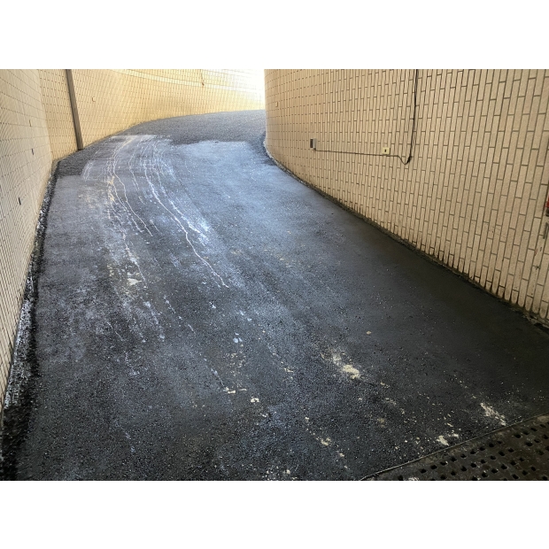 社區地下室斜坡車道路面由於長期使用,加上受到天氣及車輛重量的影響,導致路面出現了明顯的破損和坑洞。